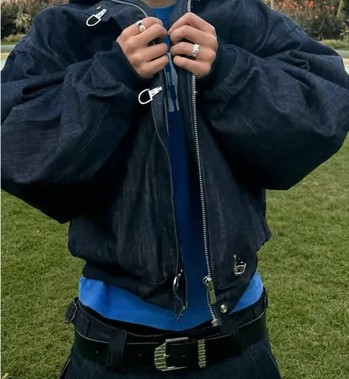 The 15oz Raw Denim Clasp Bomber Jacket is crafted from raw indigo denim and features a hand-dyed pattern, making each piece uniquely textured and one-of-a-kind. Filled with cotton down and lined with quilted nylon, it offers warmth and comfort, while the oversized cropped fit and heavy-duty metal clasp closure add a modern urban edge. Functional details like the double zip, open-end hip pockets, and bomber-style arm zipper blend utility with style, creating a bold and layered statement piece for the urban explorer who values individuality.